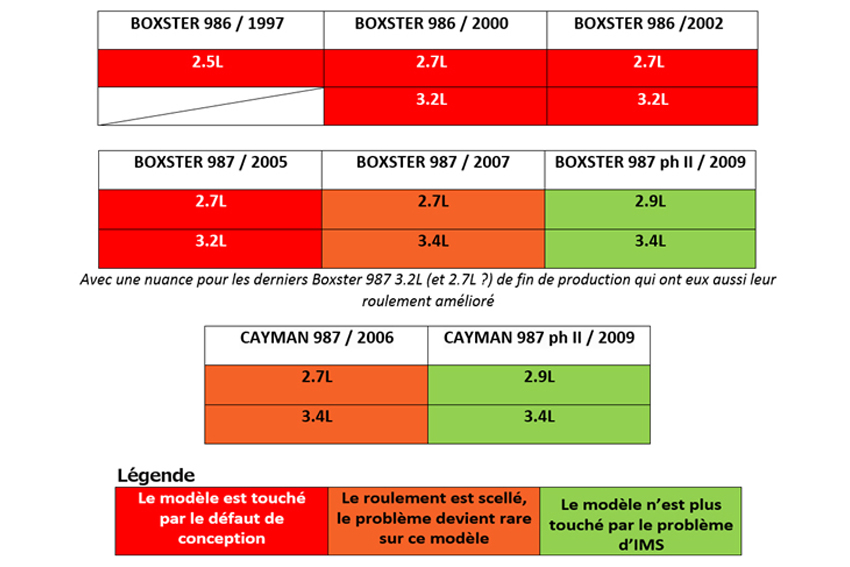 Ce tableau indique les modèles touchés ou non par le problème de l'usure de l'IMS