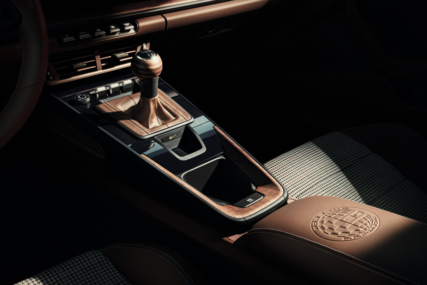 Console centrale avec pommeau de vitesse exclusif dans la 911 GT3 90 F.A. Porsche 2026